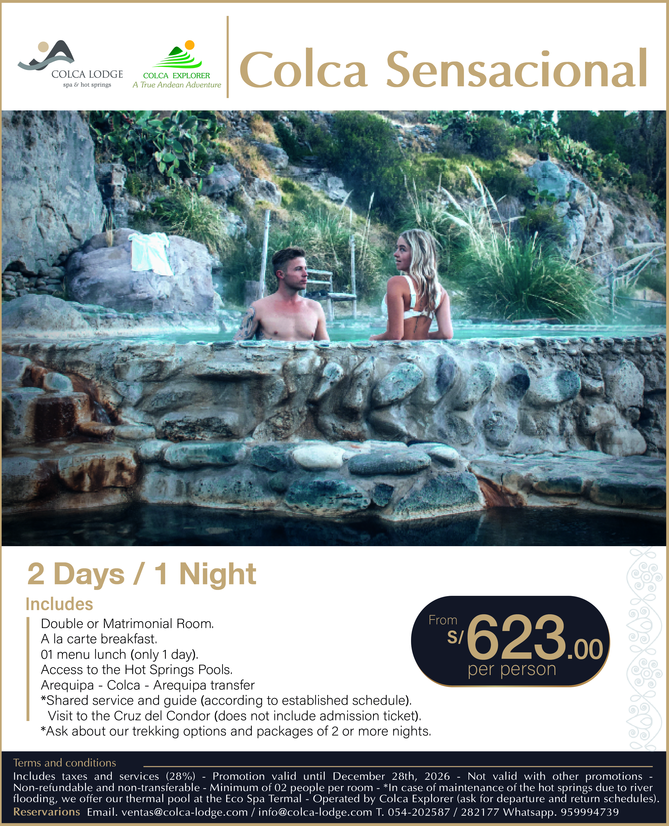 It includes a buffet breakfast, a traveler's lunch menu (for 2 people / beverages not included) and access to the thermal pools and the alpaca ranch. Additionally, we offer free activities such as bike rides, recreational fishing, visits to the Uyo Uyo ruins, and bonfires.