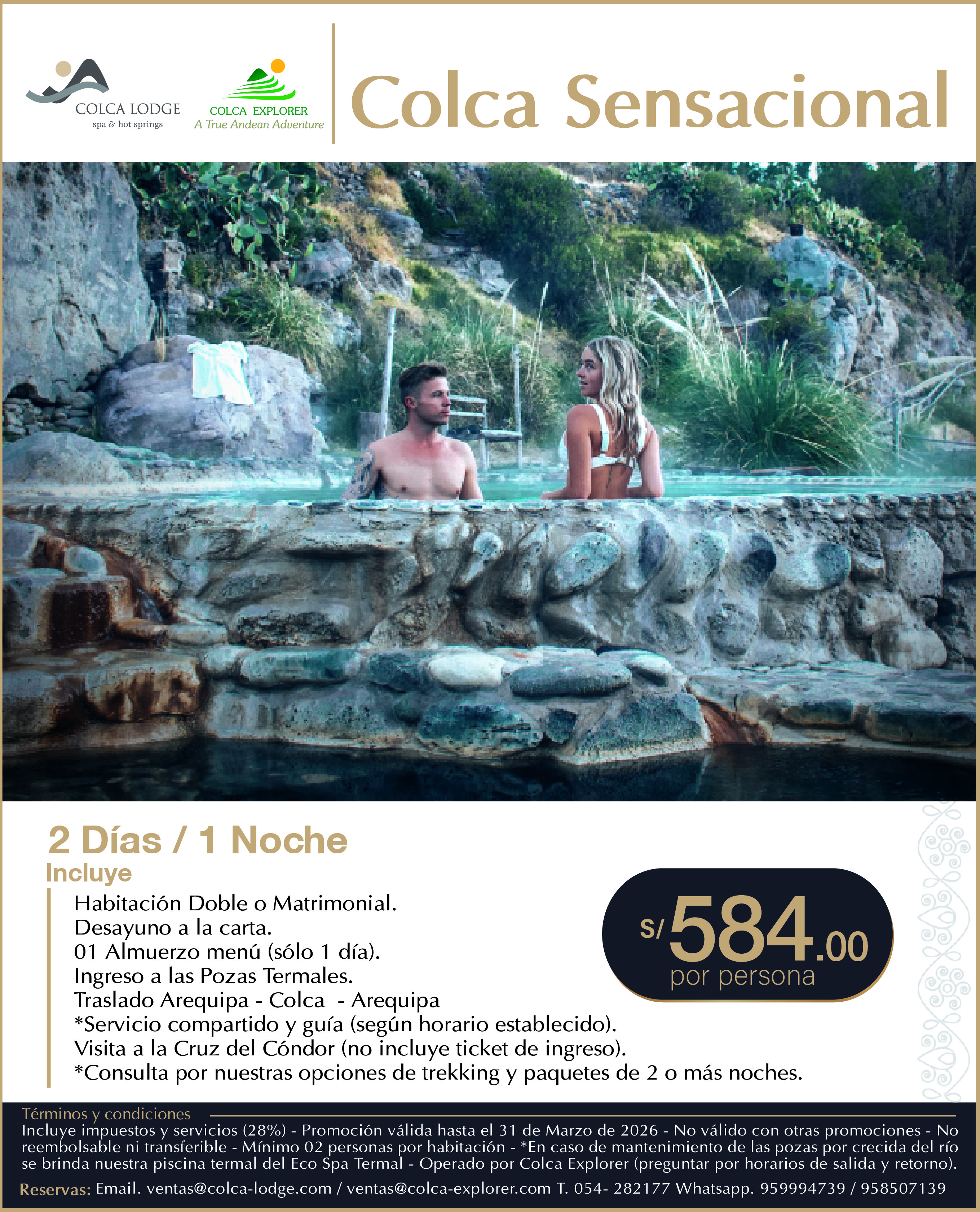 Incluye desayuno buffet, almuerzo menú viajero (02 personas / no incluye bebidas) e ingreso a las pozas termales y al rancho alpaca. Adicionalmente contamos con actividades gratuitas como paseo en bicicleta, pesca recreativa, visita a las ruinas de Uyo Uyo y fogatas.
